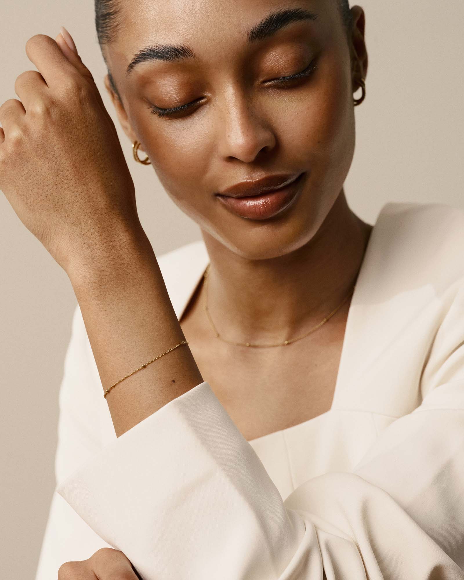 The beaded bracelet has a soft, tactile quality that makes it a joy to wear, smooth round links that catch the light without ever feeling overdone. A quiet essential that layers beautifully or holds its own all on its own.