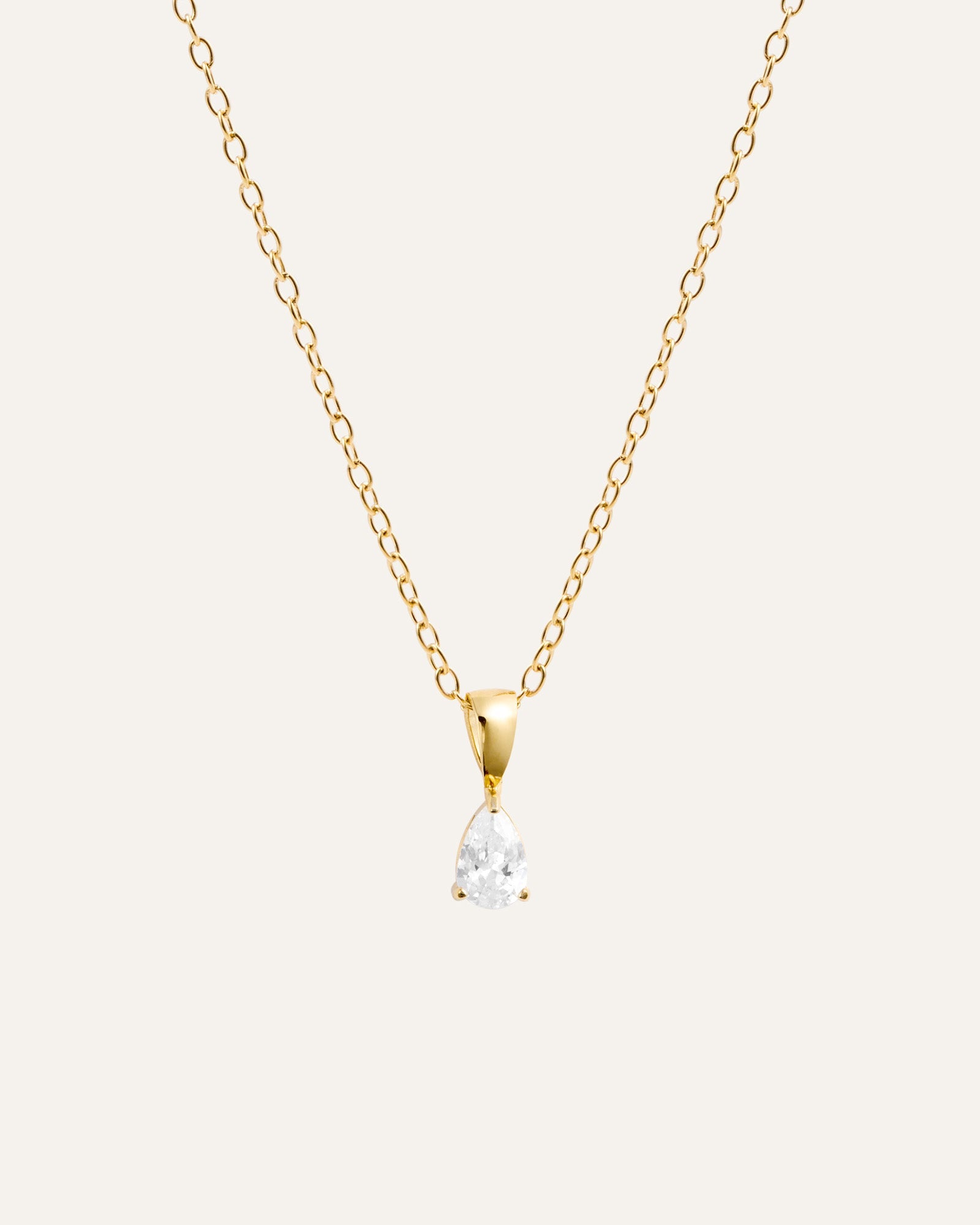 Belle White Necklace is een minimalistische ketting met een witte, peervormige steen aan een dunne ketting. Gemaakt van roestvrij staal met een 18K goudkleurige PVD-coating – duurzaam en waterbestendig, zodat het zijn kleur en glans behoudt.