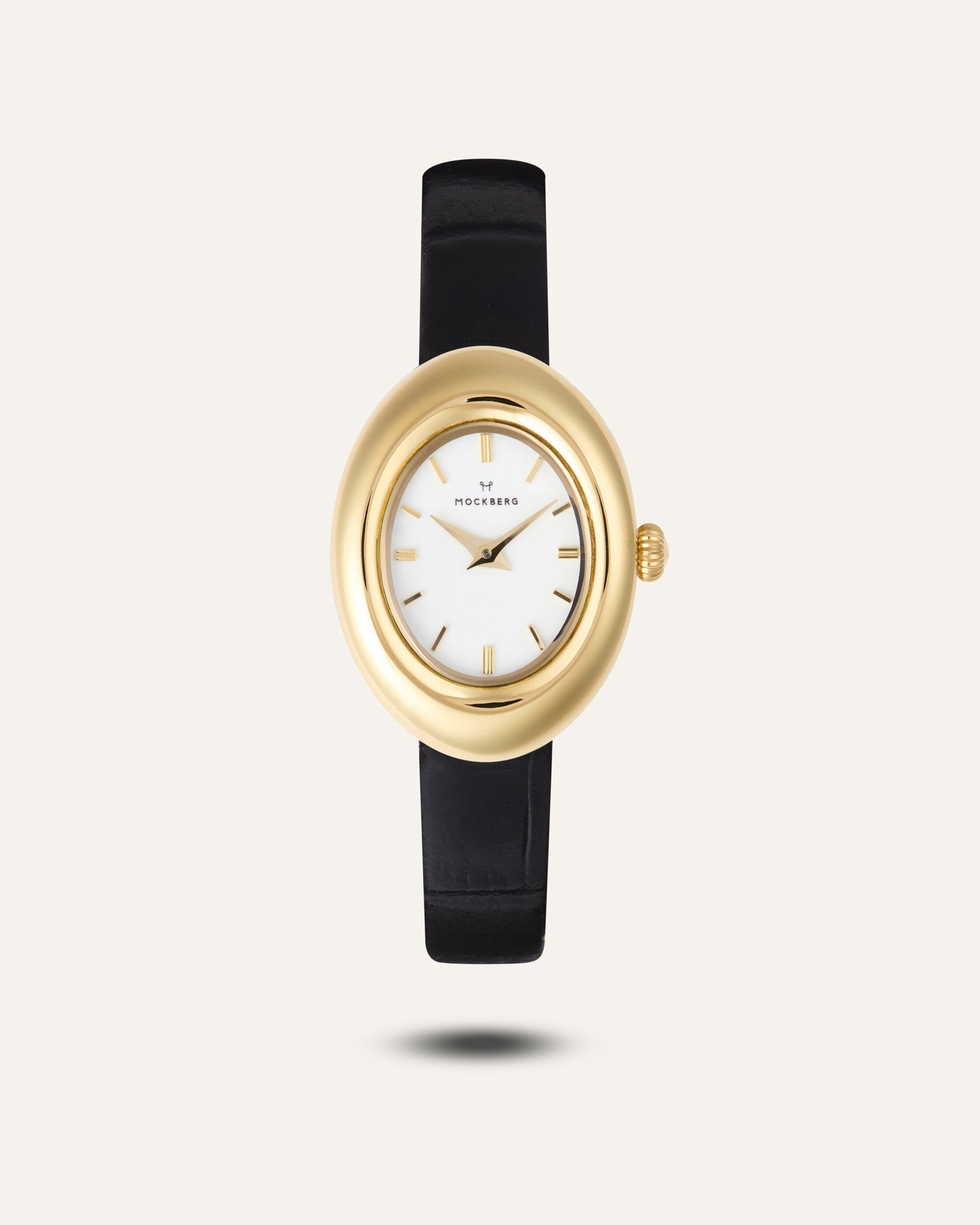De Belle Oval Leather heeft hetzelfde elegante ontwerp als de Belle Oval Watch, maar met een klassieke zwarte leren band. De zacht afgeronde ovale kast wordt gecombineerd met tijdloos leer voor een elegante uitstraling.