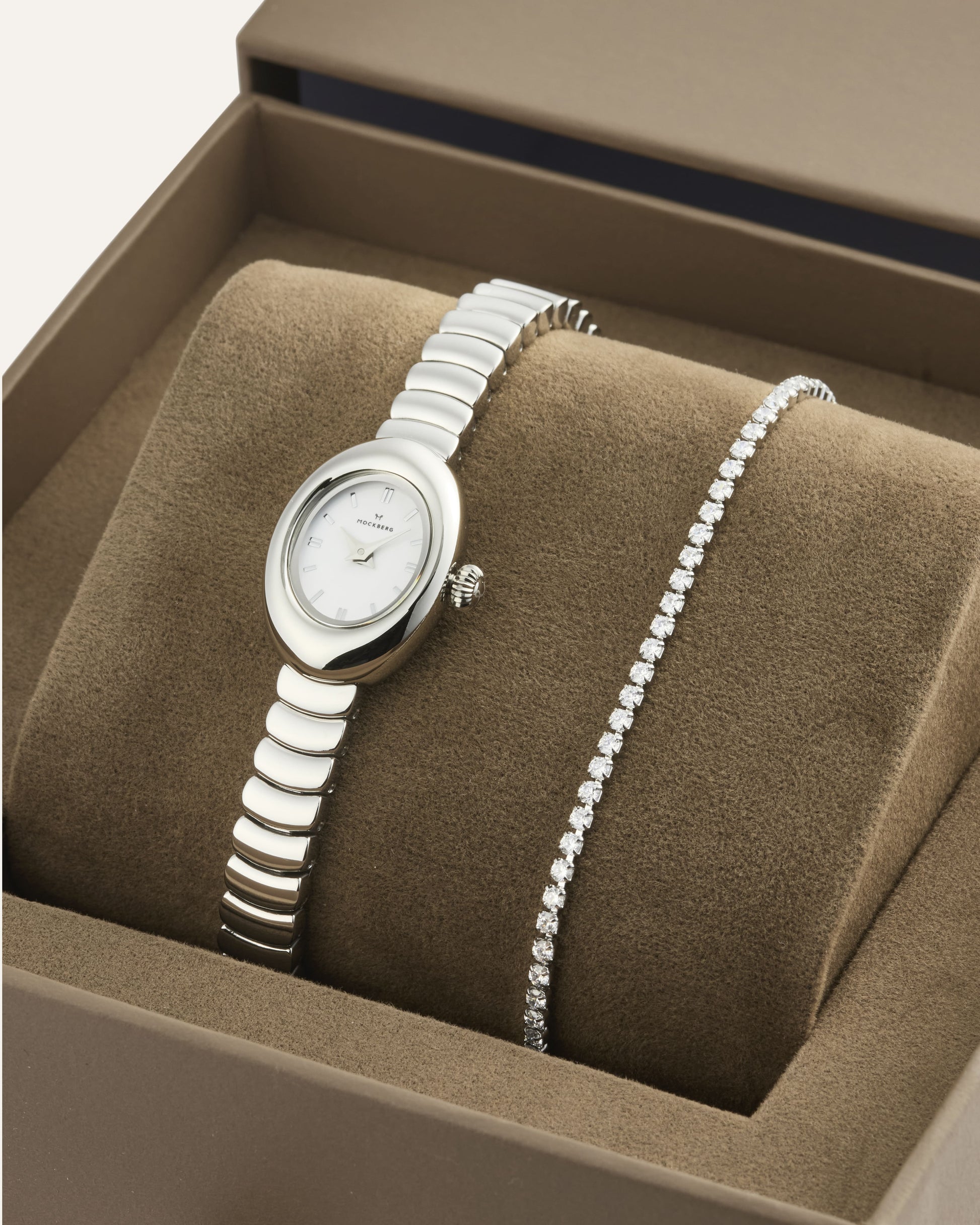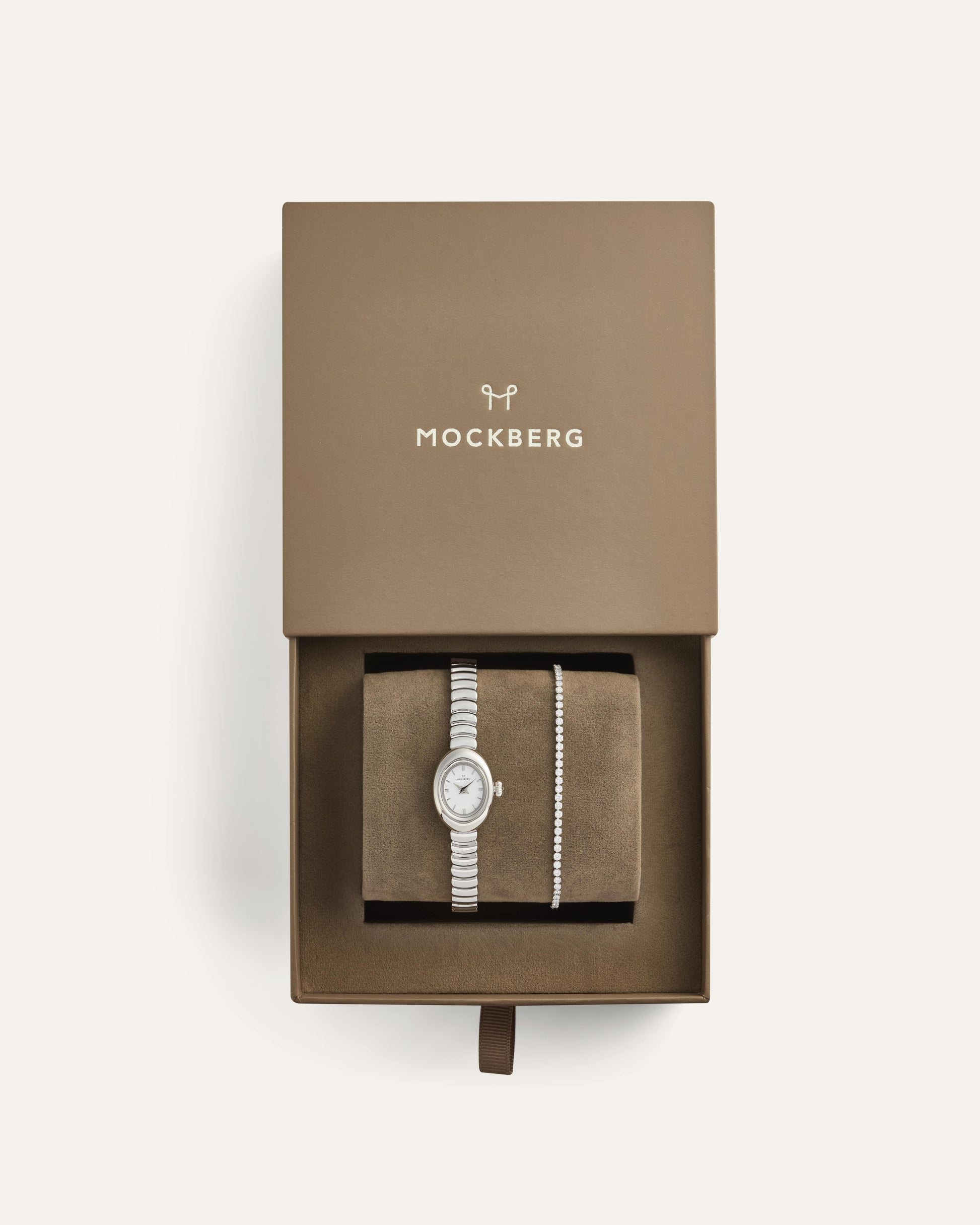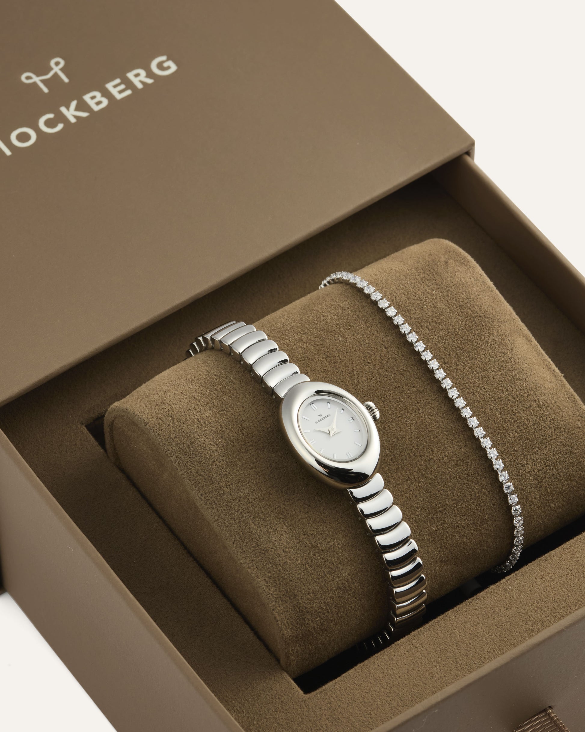 Mockberg’s gift set with the Belle Oval Petite watch and bracelet delivers a classic, cohesive look that suits both everyday wear and special occasions. The combination is easy to style and adds a refined touch without overpowering your outfit. The watch and bracelet are delivered together in a gift box.