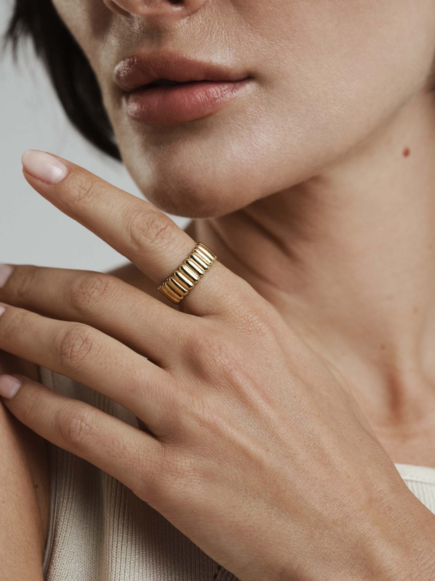 De Chic Ribbed Ring heeft een breed, geribbeld ontwerp. Gemaakt van massief roestvrij staal met een duurzame 18K goudkleurige PVD-coating – waterbestendig en slijtvast. Draag hem elke dag – zwem, douche en sport zonder je zorgen te maken over verkleuring.