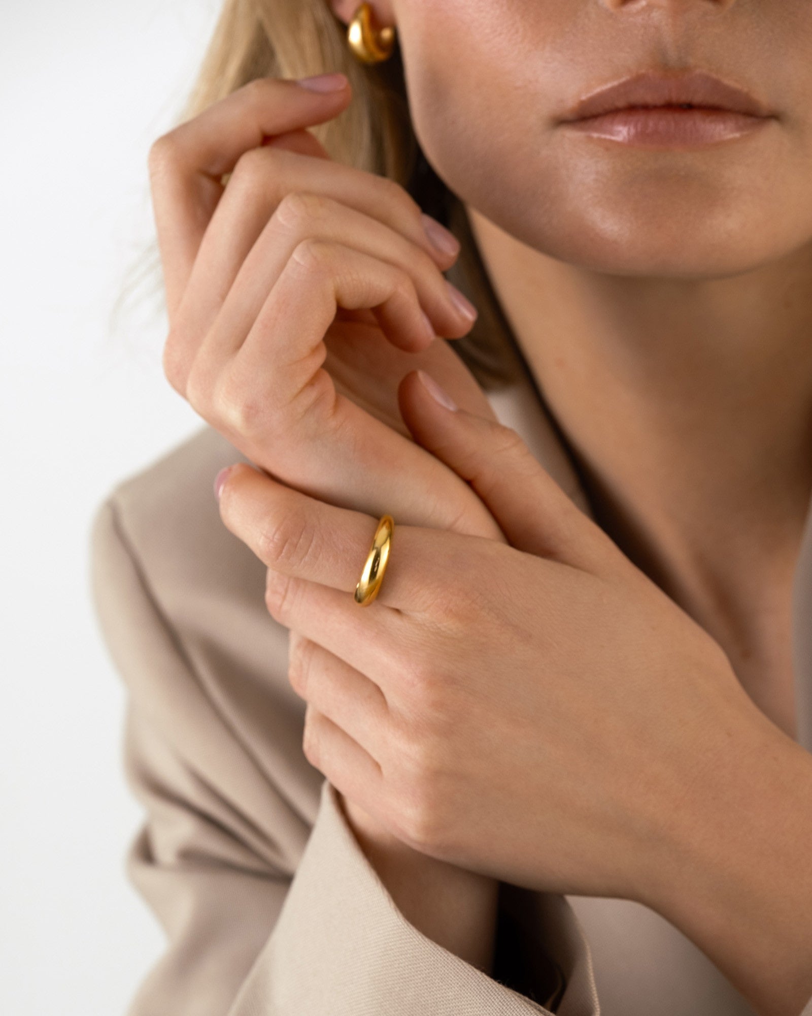 De Classic Ring is een tijdloze ring met een gladde, gepolijste afwerking. Gemaakt van roestvrij staal met een 18K goudkleurige PVD-coating – waterbestendig en duurzaam. Draag hem elke dag – zwem, douche en sport zonder je zorgen te maken over verkleuring.