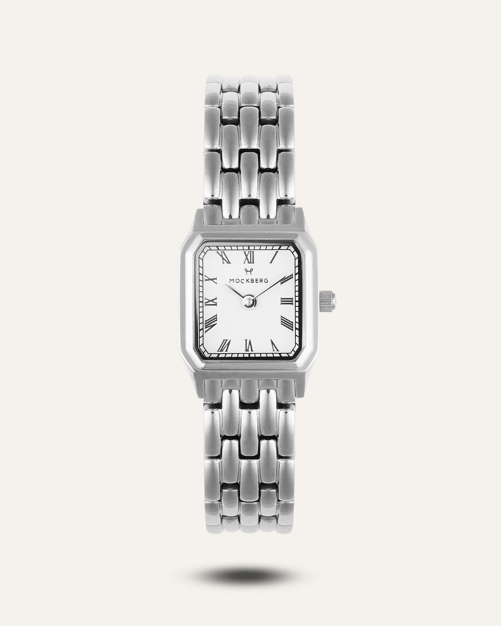Een klassieker met een tijdloos ontwerp. De roestvrijstalen kast omlijst een wijzerplaat met Romeinse cijfers en wordt gecombineerd met een traditionele schakelband.
