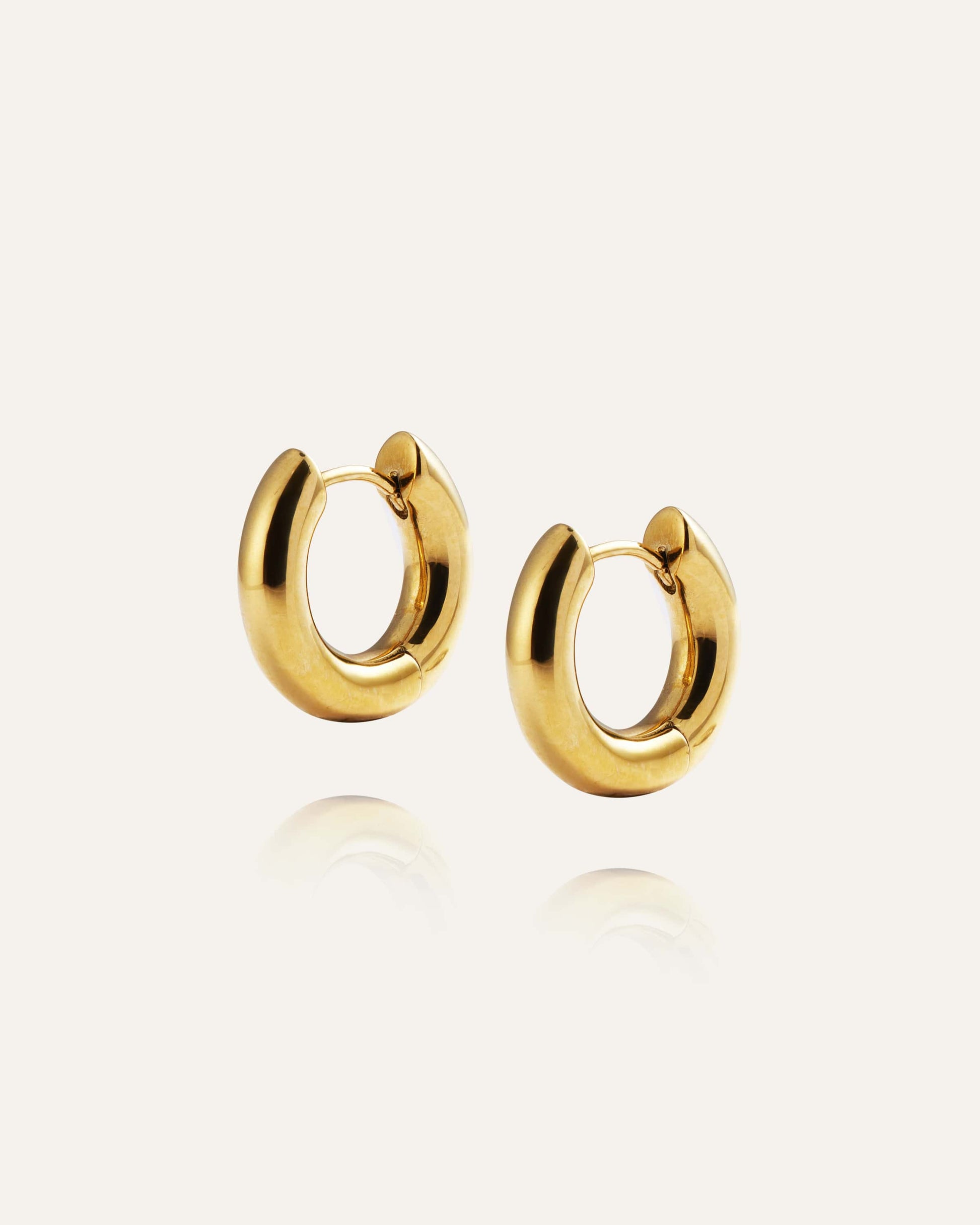 Hoop oorbellen met een zachte, moderne vorm, vervaardigd uit massief roestvrij staal met een 18K goudkleurige PVD-coating. Duurzaam en waterbestendig – ze behouden hun kleur en stijl in de loop der tijd. Een combinatie van elegantie en duurzaamheid voor jouw dagelijkse look.