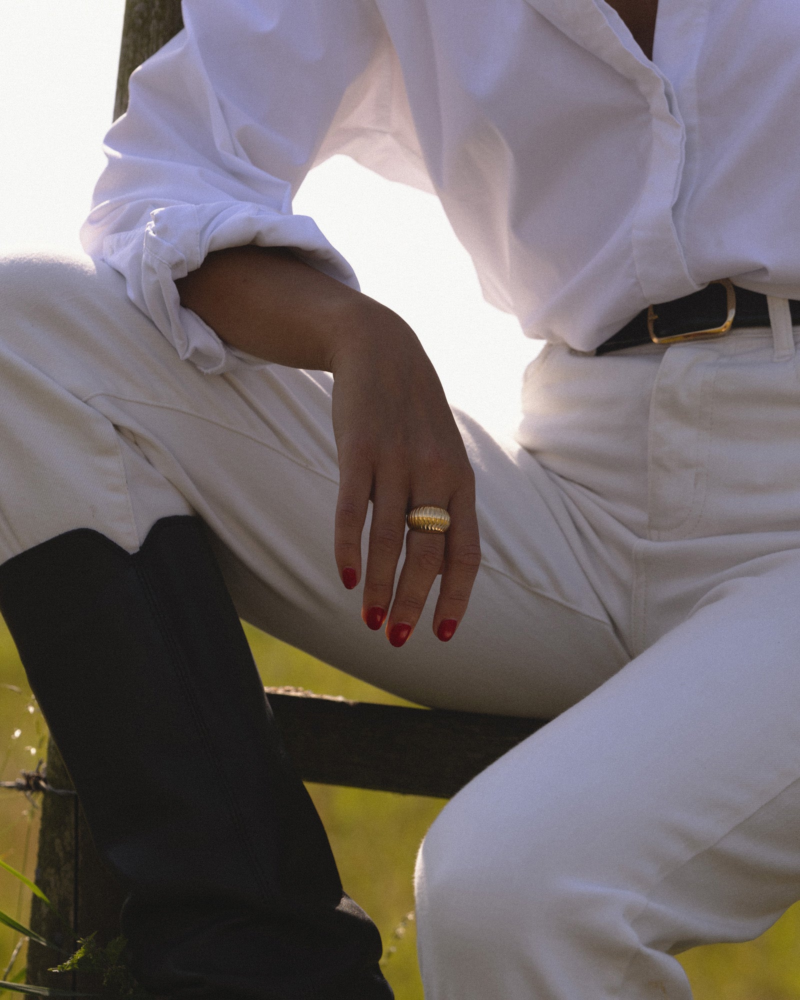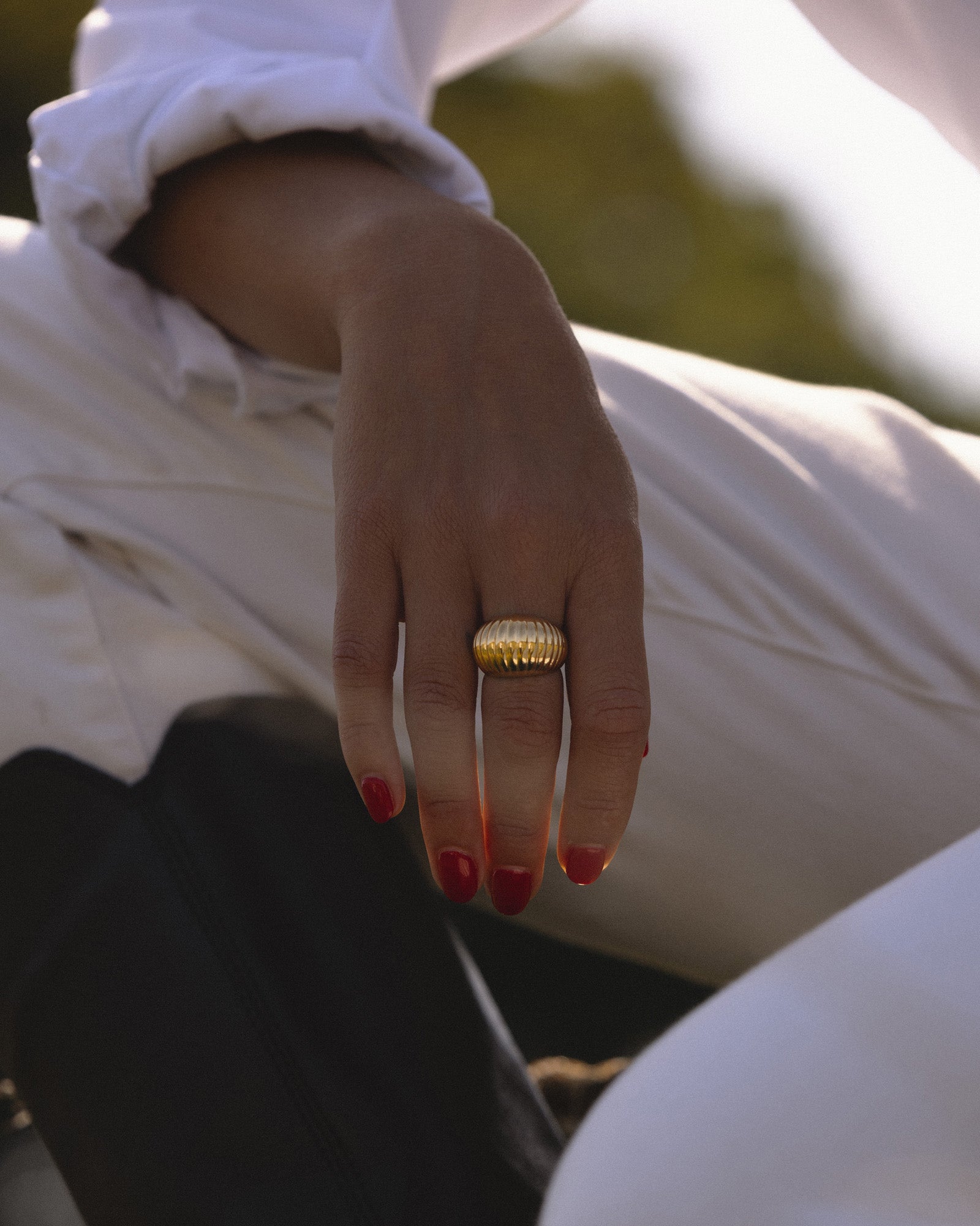 De Henriette Ring heeft een afgeronde, geribbelde structuur die een uitgesproken design creëert en een krachtig statement maakt. De ring is geïnspireerd op Henriette Widerberg – een baanbrekende operazangeres en de eerste vrouw in Zweden die in 1850 een autobiografie publiceerde. In haar boek deelde zij moedig de ongelijkheden die ze ervoer in een door mannen gedomineerde samenleving – iets wat in die tijd zeer ongewoon was. Haar kracht en moed om tegen de norm in te gaan inspireren tot het volgen van je eigen pad. Draag de Henriette Ring als symbool van kracht, lef en het doorbreken van barrières – net zoals Henriette Widerberg dat deed.