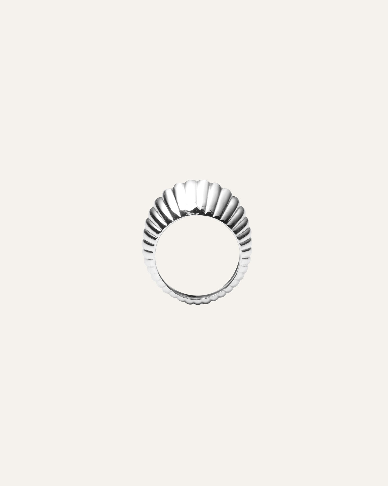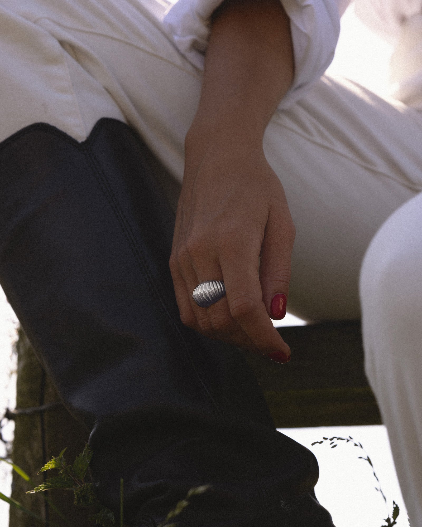 De Henriette Ring heeft een afgeronde, geribbelde structuur die een uitgesproken design creëert en een krachtig statement maakt. De ring is geïnspireerd op Henriette Widerberg – een baanbrekende operazangeres en de eerste vrouw in Zweden die in 1850 een autobiografie publiceerde. In haar boek deelde zij moedig de ongelijkheden die ze ervoer in een door mannen gedomineerde samenleving – iets wat in die tijd zeer ongewoon was. Haar kracht en moed om tegen de norm in te gaan inspireren tot het volgen van je eigen pad. Draag de Henriette Ring als symbool van kracht, lef en het doorbreken van barrières – net zoals Henriette Widerberg dat deed.