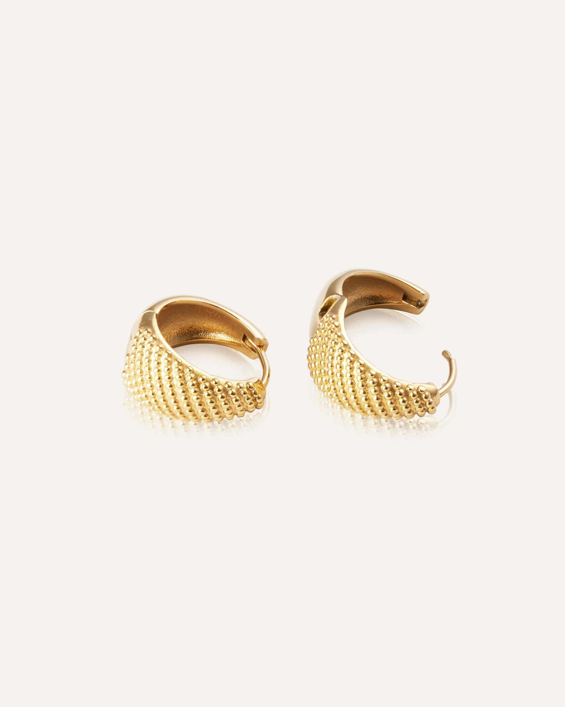 Honey Hoops hebben een uniek ontwerp met een gestructureerd patroon dat ze onderscheidt van de klassieke Bold Hoops. Gemaakt van massief roestvrij staal met een 18K goudkleurige PVD-coating – duurzaam en waterbestendig.