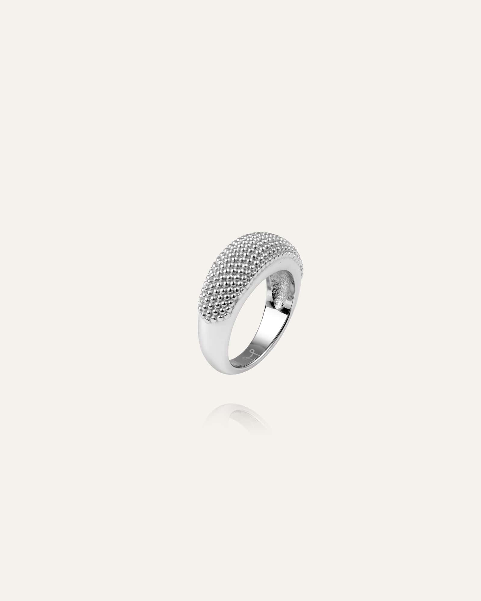 Honey Ring – een afgerond ontwerp met een gestructureerd patroon. Gemaakt van massief roestvrij staal met een PVD-coating – duurzaam en waterbestendig. Draag hem elke dag – zwem, douche en sport zonder je zorgen te maken over kleurverlies.