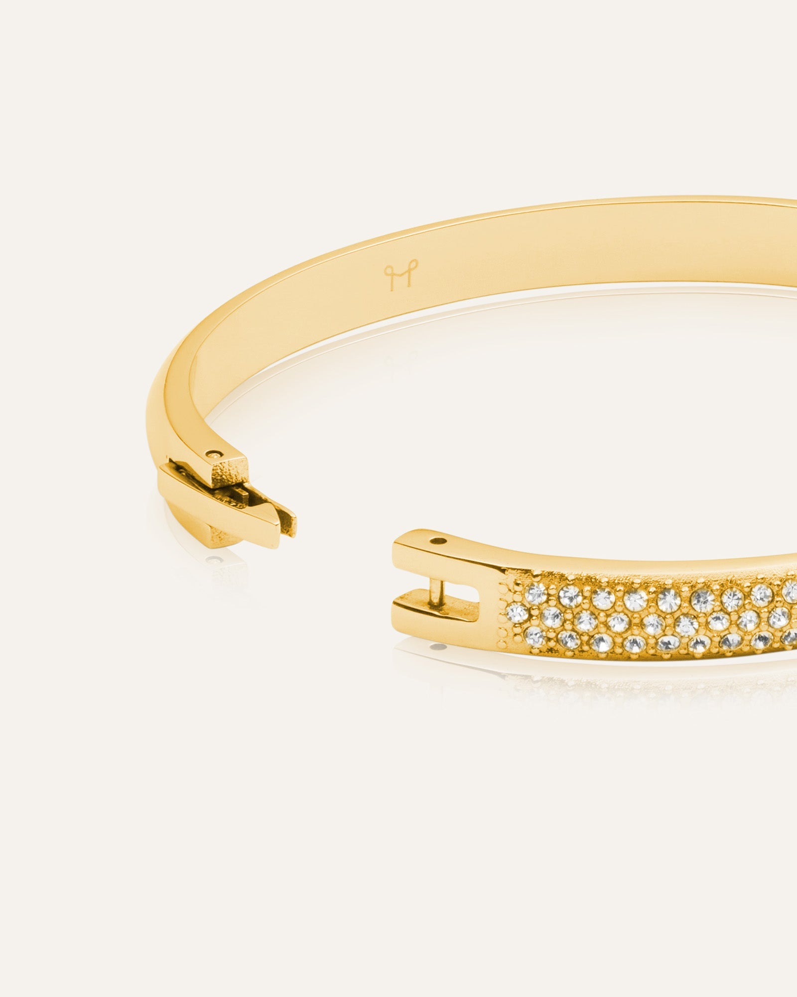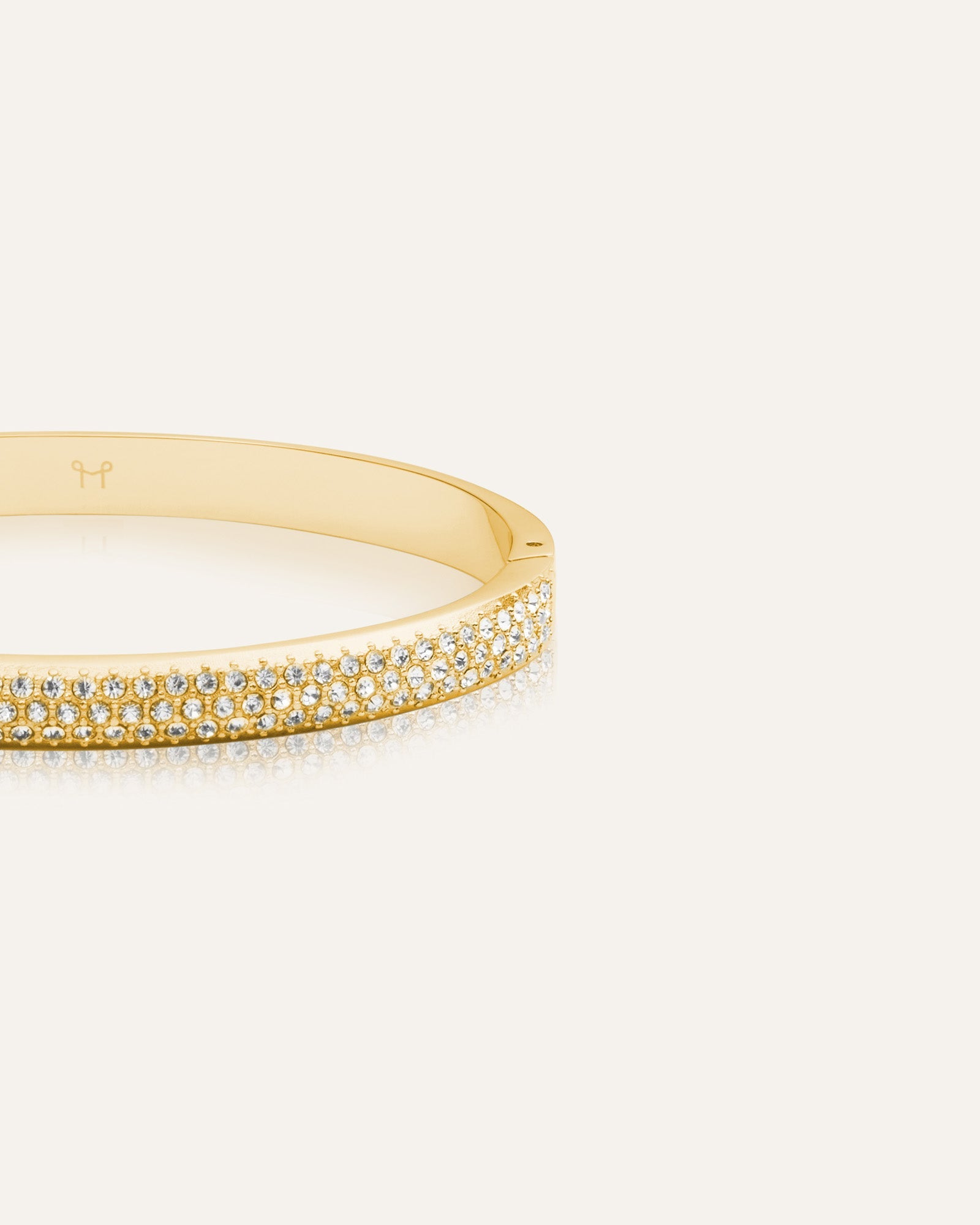 De Margit Bracelet is een armband in bangle-stijl, versierd met kleine witte steentjes over het gehele oppervlak. Een strak ontwerp dat zowel op zichzelf gedragen kan worden als gecombineerd met andere armbanden. Geïnspireerd op Margit Nordin – de eerste vrouw die in 1923 de Vasaloppet voltooide. Haar prestatie was baanbrekend, ook al mochten vrouwen daarna niet meer deelnemen tot 1981. Toch bleven dappere vrouwen meedoen, vermomd als mannen, gedreven door dezelfde wilskracht en passie als Margit. Gemaakt van roestvrij staal met een 18K goudkleurige PVD-coating – duurzaam en waterbestendig, en behoudt zijn kleur en glans in de loop der tijd.