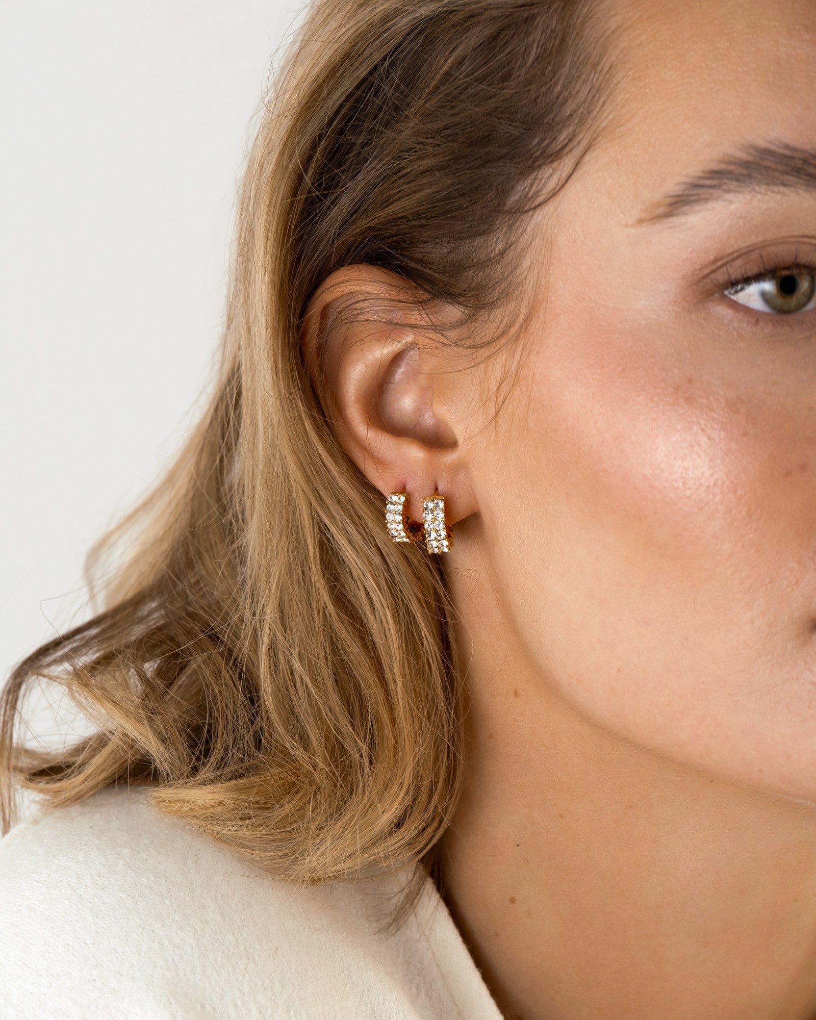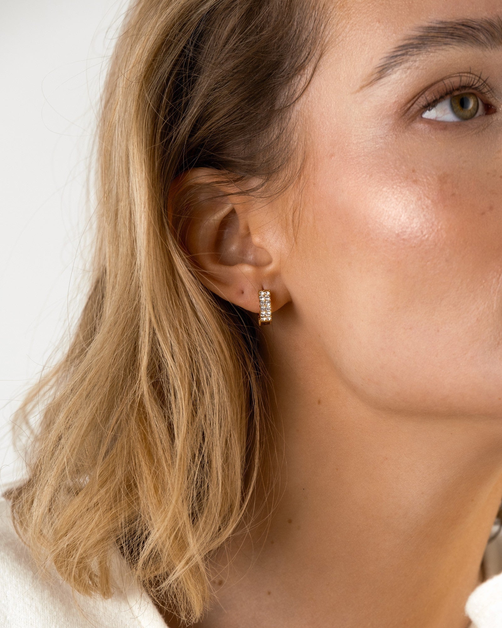 Elegante oorringen met fonkelende witte cubic zirconia-stenen. Gemaakt van massief roestvrij staal met een 18K goudkleurige PVD-coating – duurzaam en waterbestendig, zodat ze hun kleur en stijl behouden. Combineer ze met onze Midnight Ring voor een complete look.