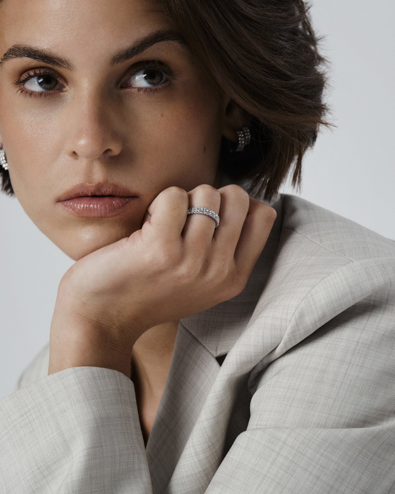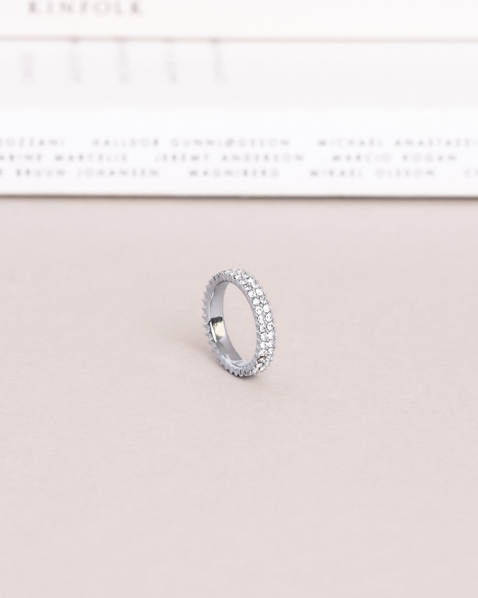Klassieke ring bedekt met kleine fonkelende witte cubic zirconia-stenen. Gemaakt van messing met een zilverkleurige PVD-coating – waterbestendig en duurzaam. Draag hem elke dag – zwem, douche en sport zonder je zorgen te maken over kleurverlies.