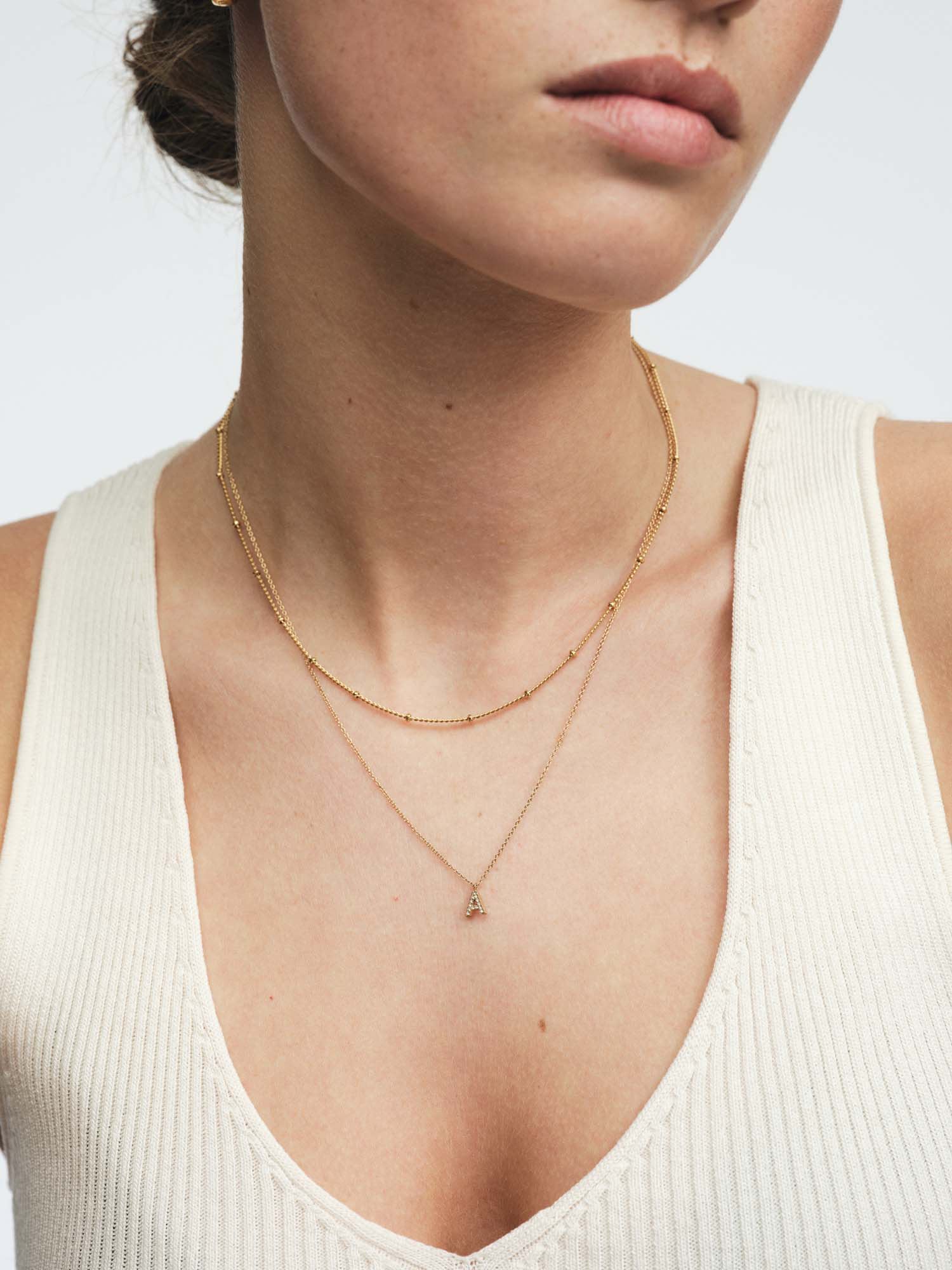 De Petite Stone Letter Necklace is een elegante en persoonlijke ketting met een fijne ketting en een letterhanger van 6 mm, versierd met fonkelende steentjes. Gemaakt van roestvrij staal met een 18K goudkleurige PVD-coating – duurzaam en waterbestendig, en behoudt zijn kleur en glans in de loop der tijd.