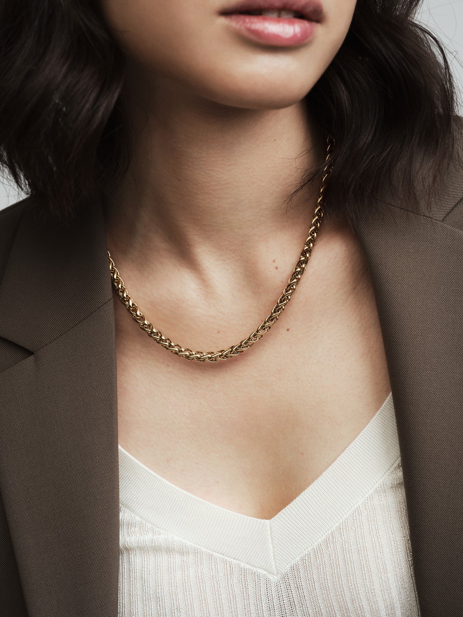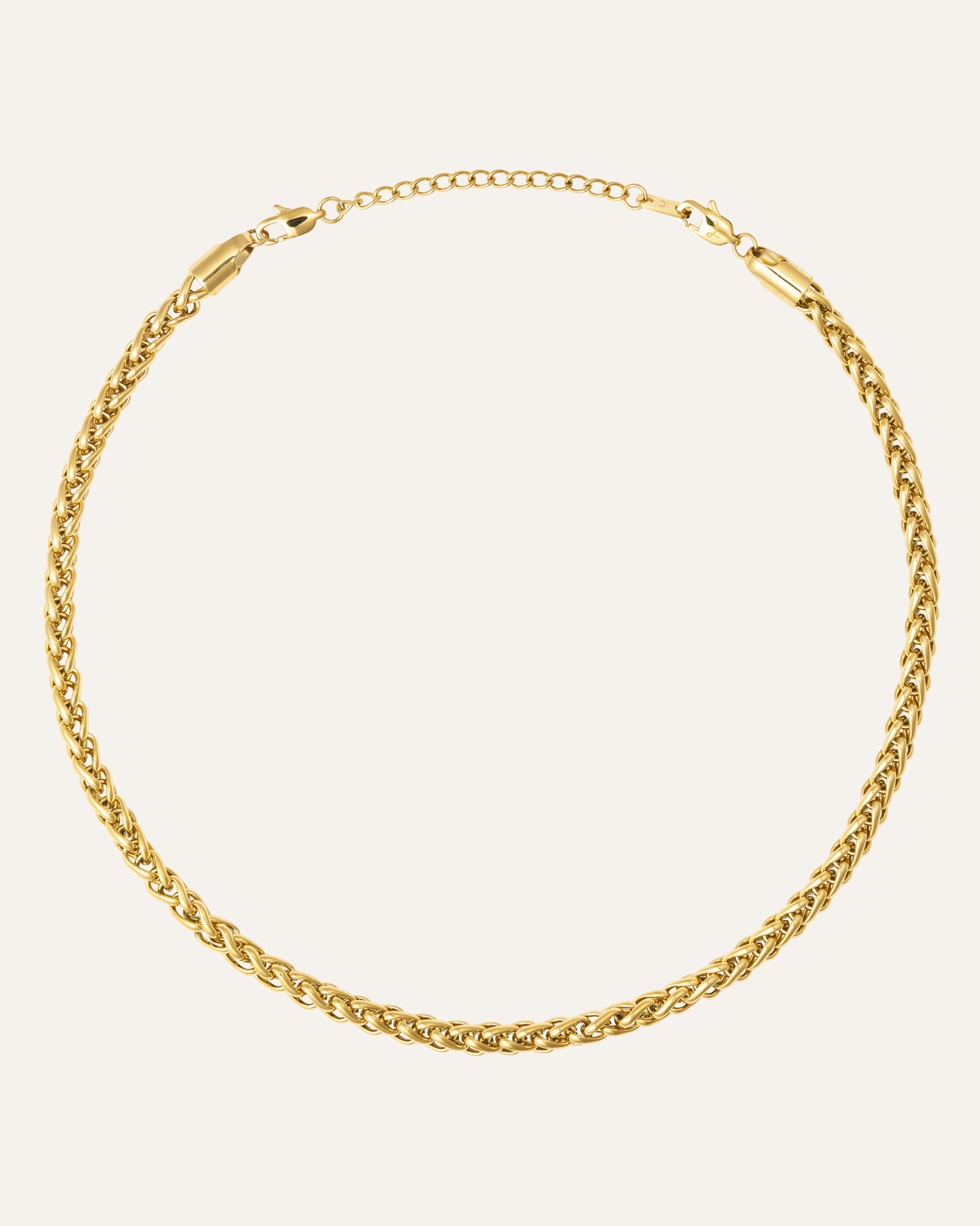 De Rebel Chain Necklace is een gevlochten schakelketting met een zwaarder design dat zorgt voor een strakke, opvallende look. Gemaakt van roestvrij staal met een 18K goudkleurige PVD-coating – duurzaam en waterbestendig, en behoudt zijn kleur en glans in de loop der tijd.