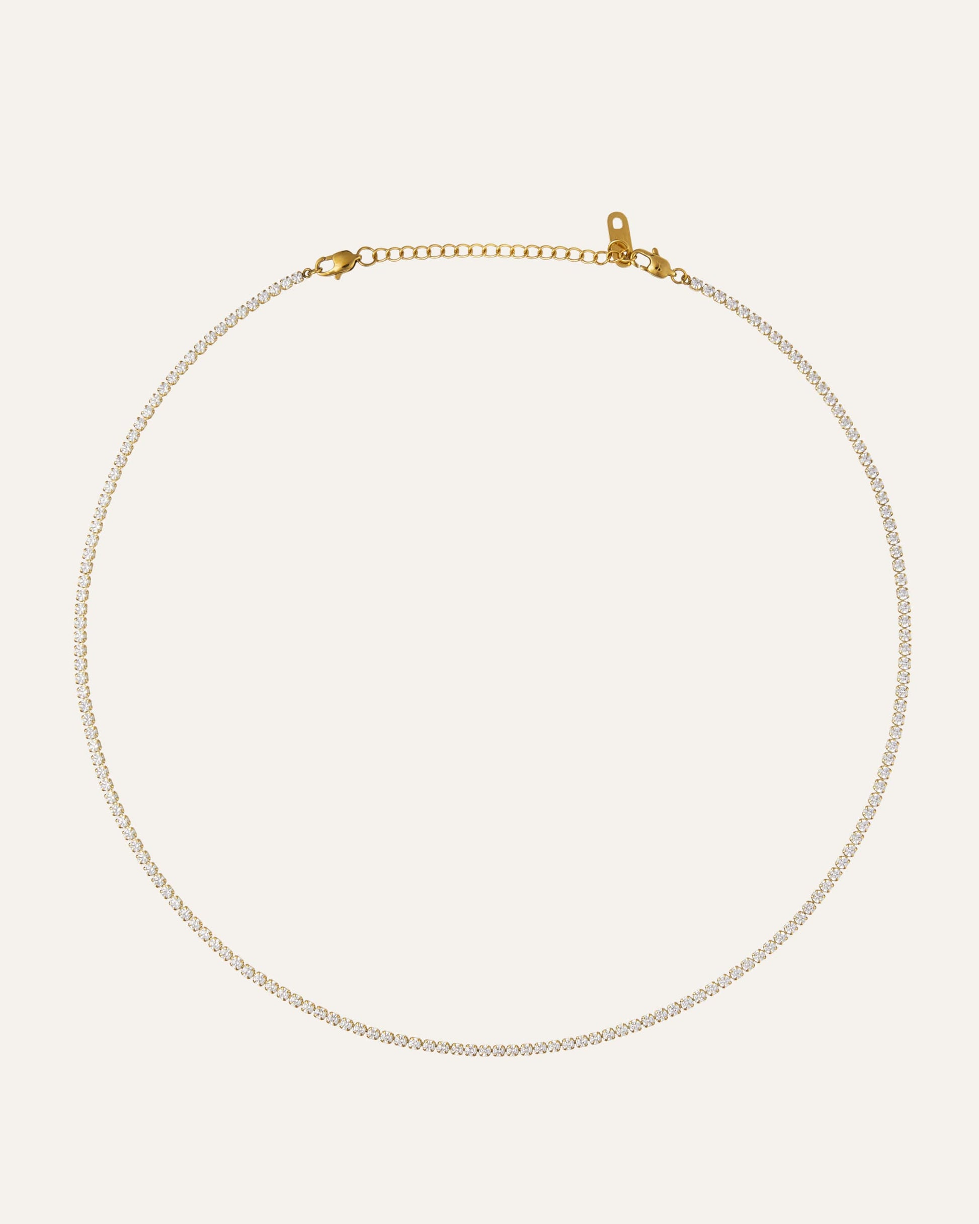 Shiny Tennis Necklace is een dunnere versie van onze klassieke Tennis-ketting, ontworpen met sprankelende kubische zirkonia-steentjes over de volledige lengte. Gemaakt van roestvrij staal met een 18K goudkleurige PVD-coating – duurzaam en waterbestendig, zodat het zijn kleur en glans in de loop der tijd behoudt. Perfect om solo te dragen of gelaagd met andere kettingen.