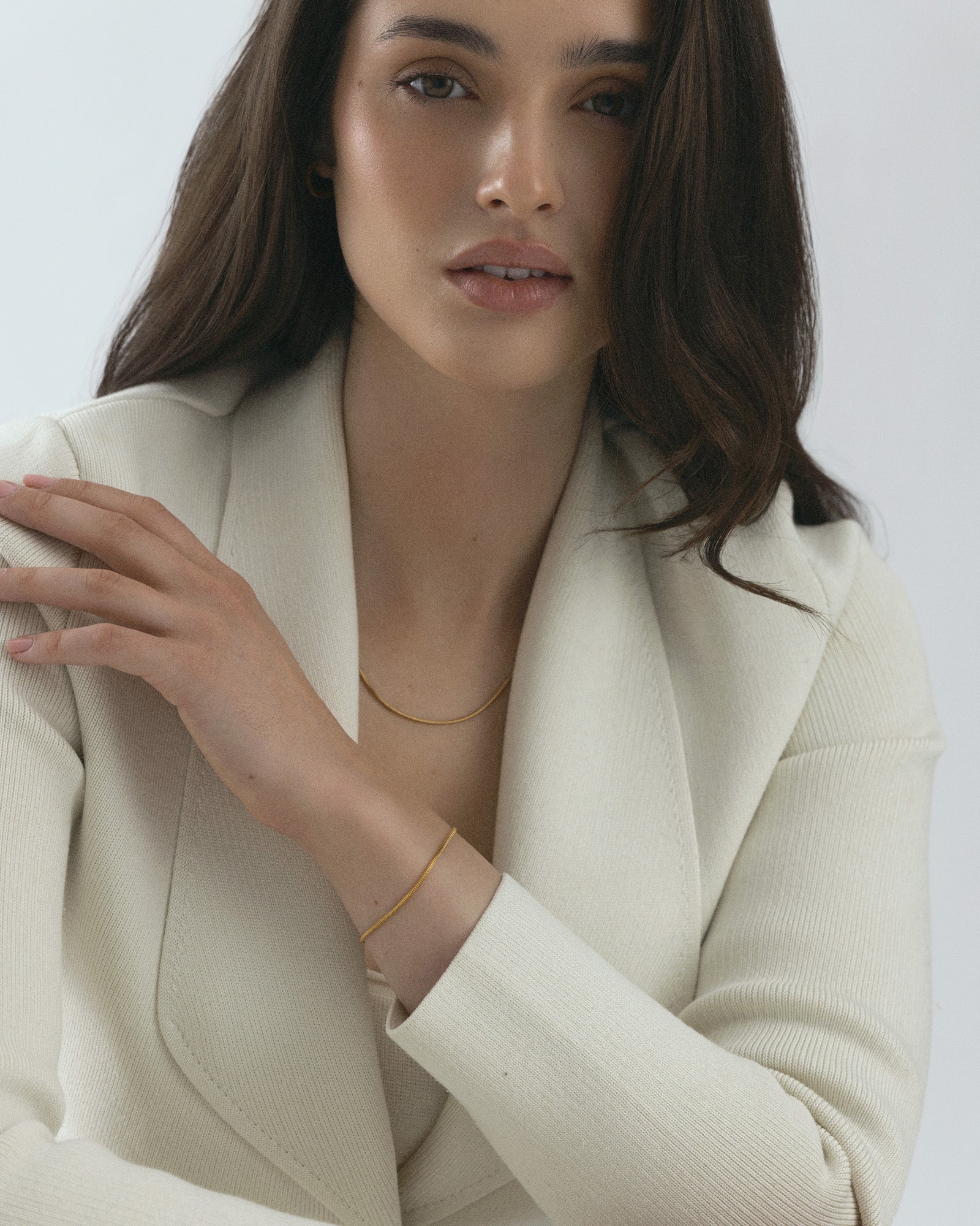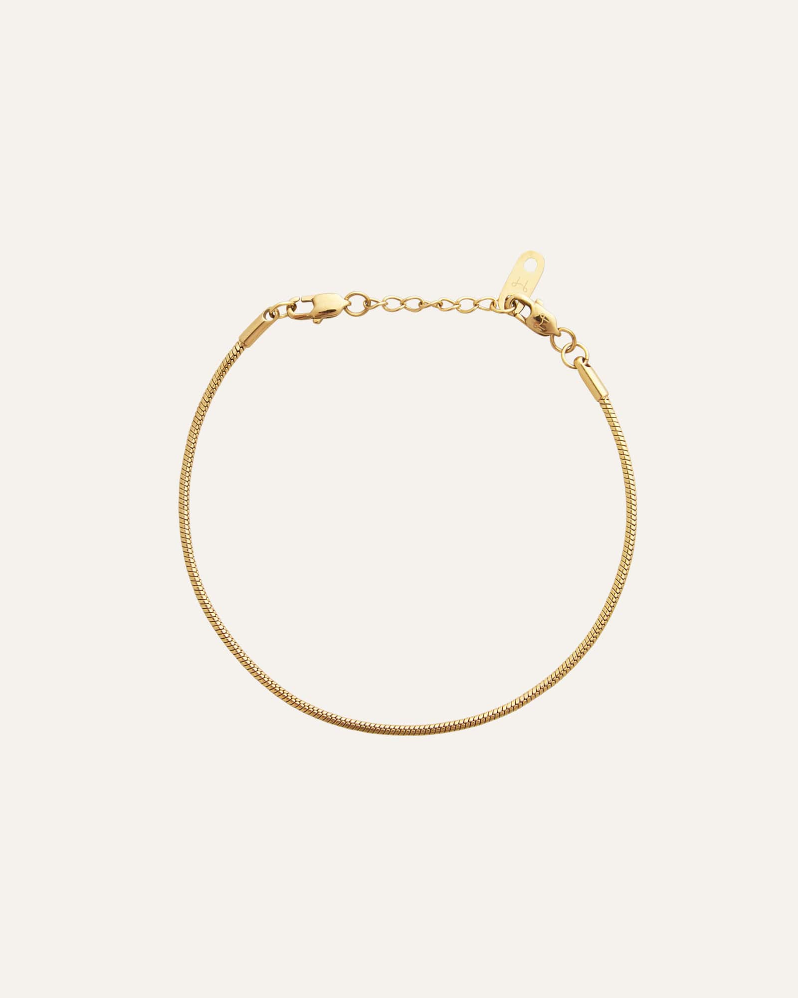Een klassiek armbandje met een zacht vloeiend design. Gemaakt van roestvrij staal met een 18K goudkleurige PVD-coating – duurzaam en waterbestendig, zodat het zijn kleur en glans in de loop der tijd behoudt. De verlengketting kan eenvoudig worden verwijderd voor een aangepaste pasvorm.