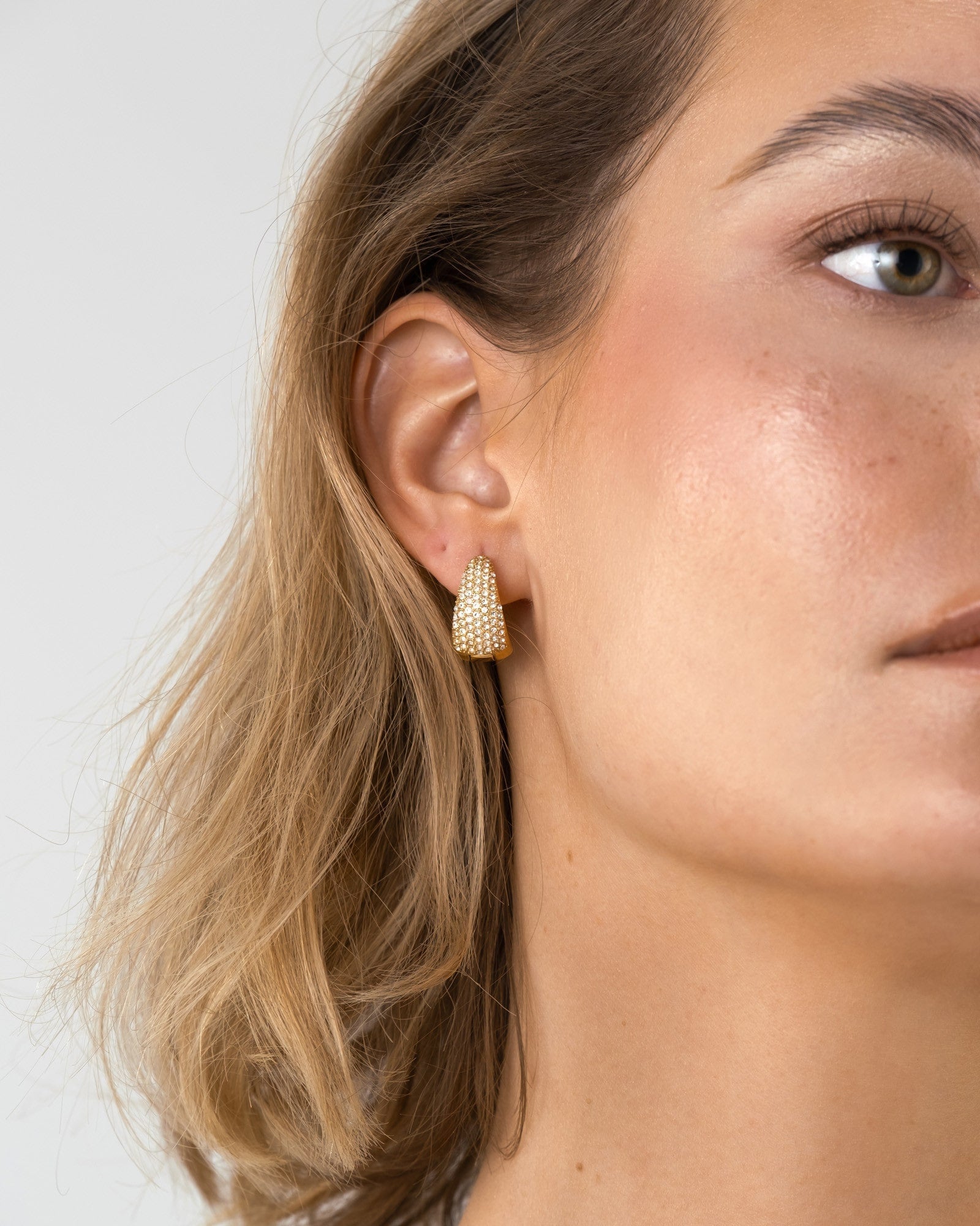 Hoepeloorbellen met zirkonia-steentjes, ontworpen om een tijdloze en moderne elegantie toe te voegen aan je look. Gemaakt van massief roestvrij staal met een 18K goudkleurige PVD-coating. Duurzaam en waterbestendig – behoudt hun kleur in de loop der tijd.