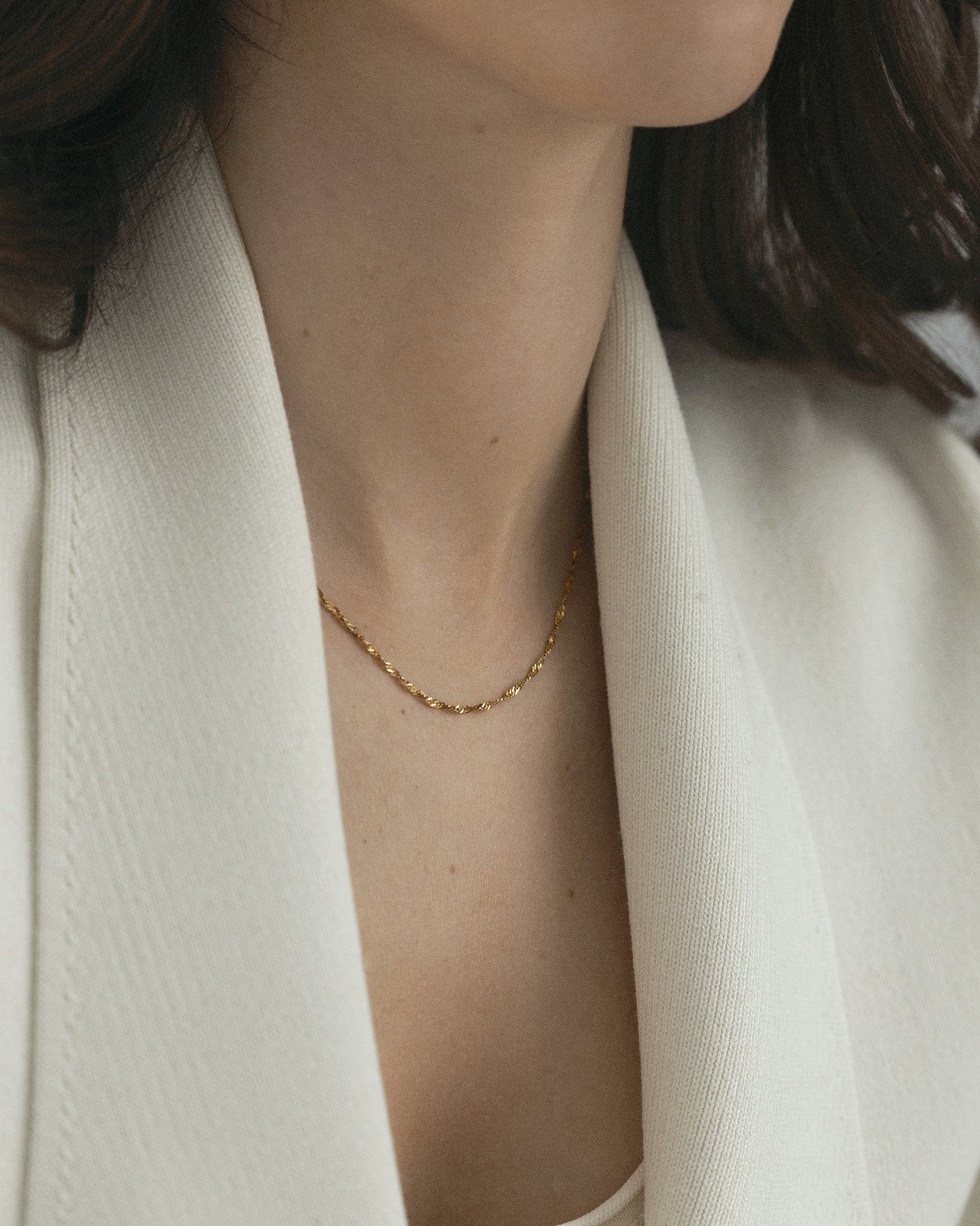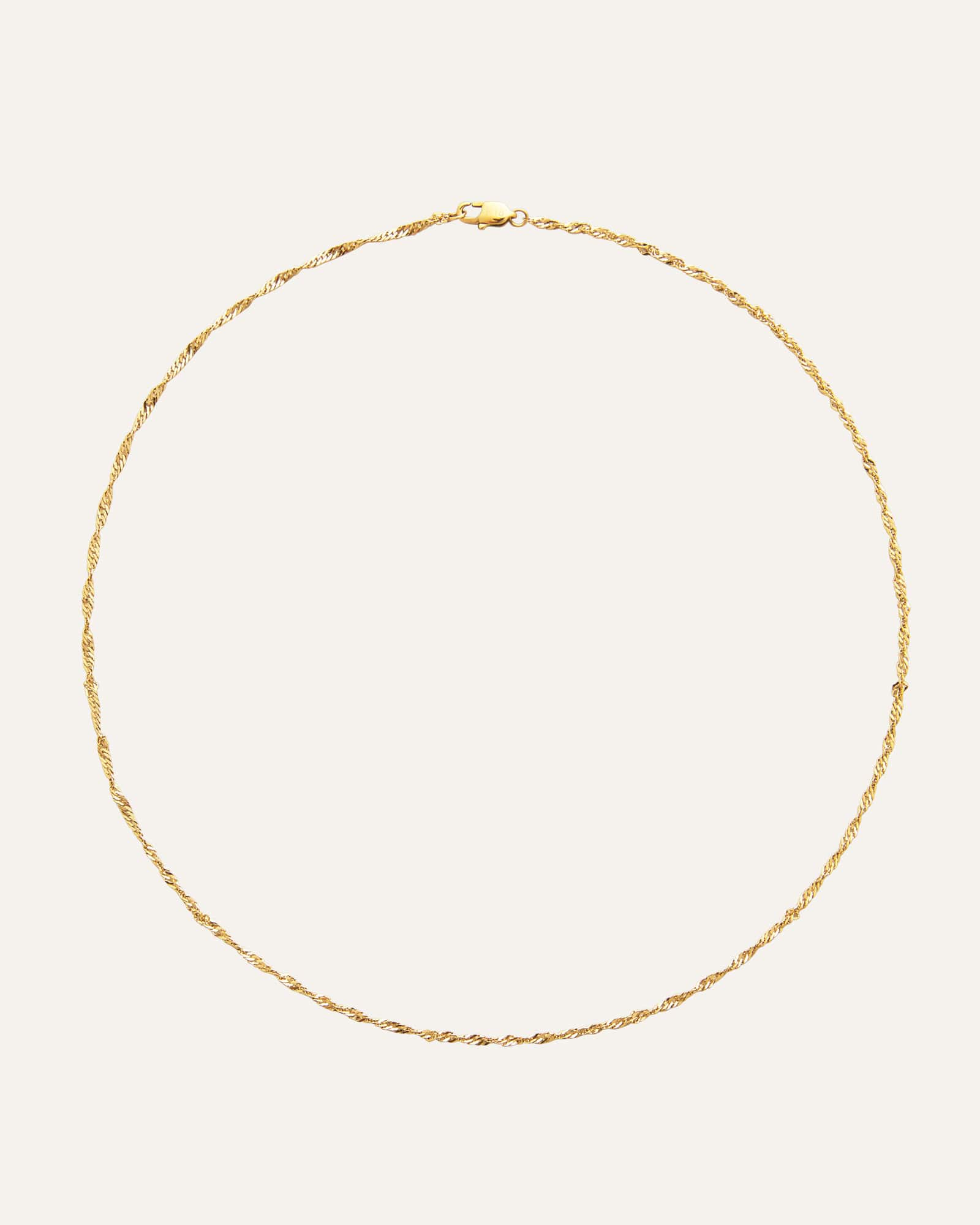 De Twirl Necklace heeft een dun, gedraaid schakeldesign – perfect om alleen te dragen of in laagjes met andere kettingen. Gemaakt van roestvrij staal met een 18K goudkleurige PVD-coating – duurzaam en waterbestendig, zodat het zijn kleur en glans behoudt. De verlengketting kan eenvoudig worden verwijderd voor een gepersonaliseerde pasvorm.